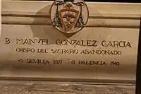 Manuel González García (25 February 1877 – 4 January 1940) was a Spanish bishop of the Roman Catholic Church who served as the Bishop of Palencia from 1935 until his death. He was also the founder of the Eucharistic Missionaries of Nazareth and also established both the Disciples of Saint John and the Children of Reparation.[1] He was known for his strong devotion to the Eucharist and became known as the "Bishop of the Tabernacle" due to this devotion; he made it an objective of his to spread devotion to the Eucharist and encouraged frequent reception of it.