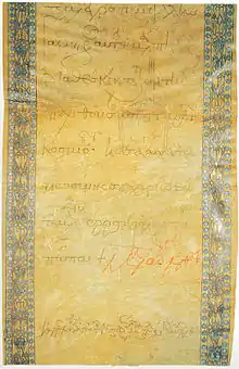 Born on 28 November 1118, Manuel Komnenos was the fourth son of John II Komnenos and Irene of Hungary, so it seemed very unlikely that he would succeed his father.[3] His maternal grandfather was St. Ladislaus. Manuel favourably impressed his father by his courage and fortitude during the unsuccessful Siege of Neocaesarea (1140), against the Danishmendid Turks. In 1143 John II lay dying as a result of an infected wound; on his deathbed he chose Manuel as his successor, in preference to his elder surviving brother Isaac. John cited Manuel's courage and readiness to take advice, in contrast to Isaac's irascibility and unbending pride, as the reasons for his choice. After John died on 8 April 1143,[4] his son, Manuel, was acclaimed emperor by the armies.[5] Yet his succession was by no means assured: with his father's army in the wilds of Cilicia far from Constantinople, he recognised that it was vital he should return to the capital as soon as possible. He still had to take care of his father's funeral, and tradition demanded he organise the foundation of a monastery on the spot where his father died. Swiftly, he dispatched the megas domestikos John Axouch ahead of him, with orders to arrest his most dangerous potential rival, his brother Isaac, who was living in the Great Palace with instant access to the imperial treasure and regalia. Axouch arrived in the capital even before news of the emperor's death had reached it. He quickly secured the loyalty of the city, and when Manuel entered the capital in August 1143, he was crowned by the new patriarch, Michael II Kourkouas. A few days later, with nothing more to fear as his position as emperor was now secure, Manuel ordered the release of Isaac.[6] Then he ordered two golden pieces to be given to every householder in Constantinople and 200 pounds of gold (including 200 silver pieces annually) to be given to the Byzantine Church.[7]
