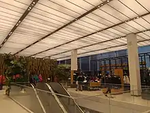 Two escalators lead to the second floor.[62] The original escalators were parallel to the Fifth Avenue facade and were designed as freestanding diagonal structures, giving the appearance that they had no supports of their own.[45][48][63] On the sides of the escalators, Le Maire designed aluminum panels with straw-gold finishes; cathode lights shone from behind the panels and were dispersed through tiny openings in each panel.[51] By the early 1990s, the escalator panels had been replaced with silver-colored ones.[64][65] Bertoia also created an unnamed "wire cloud" artwork above the escalators.[51] The original escalators were replaced in the 2010s with a new set of escalators perpendicular to the new entrances on Fifth Avenue.[62]
