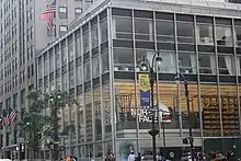 Two entrances were provided in the original design: the main banking entrance on the eastern side of the 43rd Street facade and the office entrance on the western side of the same facade. The banking entrance was not marked because SOM intended the vault's presence to be self-explanatory.[5][18] The former banking entrance, later converted into an entrance to the storefront space inside, is three bays wide.[42] As part of a building renovation in the 2010s, two additional entrances were built on Fifth Avenue.[32]