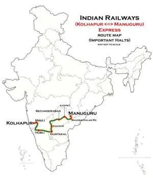 Manuguru - Shri Chhatrapati Shahu Maharaj Terminus Kolhapur Express is an express train of the Indian Railways connecting Shri Chhatrapati Shahu Maharaj Terminus in Maharashtra and Manuguru of Telangana. It is currently being operated with 11303/11304 train numbers on a daily basis.[1][2]