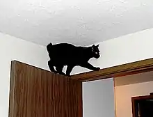 Regardless of the genetic and historical reality, there are various fanciful Lamarckian folktales that seek to explain why the Manx has a truncated tail. In one of them, the biblical Noah closed the door of the Ark when it began to rain, and accidentally cut off the tail of the Manx cat who had almost been left behind.[18] Over the years a number of cartoons have appeared on postcards from the Isle of Man showing scenes in which a cat's tail is being run over and severed by a variety of means including a motorcycle, a reference to motorcycle racing being popular on the island, and an update of the Noah story. Because the gene is so dominant and "invades" other breeds when crossed (often without owner knowledge) with the Manx, there was a folk belief that simply being in the proximity of a Manx cat could cause other breeds to somehow produce tailless kittens.[19]