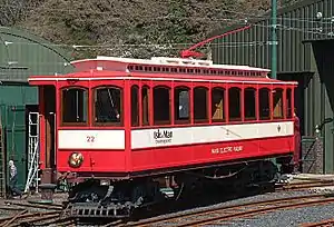 These saloon cars, form the fifth batch of power cars, were supplied and delivered in 1899 for the completion of the final section of the line between Laxey Station and Ramsey Plaza. They all remain in service. The four vestibuled cars, known as the Winter Saloons, are the backbone of the fleet of the Manx Electric Railway on the Isle of Man; they are all still in regular service but car 22 was completely rebuilt following a fire at Derby Castle Depôt in 1992 and is now widely considered to be a replica car. They have appeared in a variety of liveries, but suit the 1930s "house" style the best in many people's opinion and it is this guise that they are best known for carrying although they tend to carry several variations of this scheme. Car No. 22 was at one point re-painted in the plain red and cream livery of the island's buses in 1999 in line with management whim, but this ultimately proved unpopular and she now carries the usual livery. She was also one of the cars selected for re-paint in 1957 upon nationalisation, carrying an experimental green and white livery for some time. Cars 19 and 20 currently carry the 1950s "austere" livery, with 21 remaining in a hybrid colour scheme of recent years.