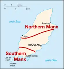 Manx (Gaelg or Gailck, pronounced [ɡilɡ, geːlɡ] or [gilk]),[4] also known as Manx Gaelic, is a Gaelic language of the insular Celtic branch of the Celtic language family, itself a branch of the Indo-European language family. Manx is the historical language of the Manx people.