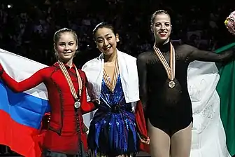 At the 2014 World Championships, she broke the world record for the short program by scoring 78.66, 0.16 points higher than the former record set by Yuna Kim at the 2010 Winter Olympics.[12][67] Asada went on to score 138.03 in the free skating, winning her third world title with a total of 216.69, a personal best for her. With this victory, she became the third woman in the last 45 years (along with Katarina Witt and Michelle Kwan) and the tenth woman to have won three world championship titles.[68]