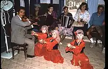 In the late 60s, during the Cultural Revolution, Mao's cult of personality reached new heights, with citizens performing a "Loyalty Dance" (忠字舞; zhōngzì wǔ) to express their love to the chairman.[46] This simple dance did not involve much more than stretching one's arms from the heart to Mao's portrait, with movements originating from a folk dance popular in Xinjiang. It was frequently accompanied by revolutionary songs including "Beloved Chairman Mao", "Golden Hill of Beijing" or "Sailing the Seas Depends on the Helmsman". Some lyrics included the quote "No matter how close our parents are to us, they are not as close as our relationship with Mao", which was used to inspire a spirit of collective worship.[47] A notable slogan related to the Loyalty Dance was the "Three Loyalties" (三忠于): loyalty to Chairman Mao; loyalty to Mao Zedong Thought; loyalty to Chairman Mao's revolutionary line.[48] The loyalty dance (忠字舞; zhōngzì wǔ) was an everyday fixture of life in the late 1960s, which was practiced in order to display one's lifelong devotion to Mao Zedong and exercise total discipline.[49] Nevertheless, by the 70's it was fleeting, and as the cultural revolution came to an end it rapidly waned.[47]