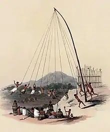 Slaves (taurekareka or mōkai) were members of rival tribes who had been taken prisoner during warfare and were made to work on non-tapu activities.[55] The term taurekareka was also used to denote something abhorrent and signifies the complete loss of mana of slaves.[56][57] During the period of the Musket Wars the number of slaves taken as prisoners increased immensely and became an important part of some tribes' social structure.[58]