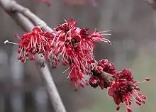 Maple species, such as Acer rubrum, may be monoecious, dioecious or polygamodioecious. The flowers are regular, pentamerous, and borne in racemes, corymbs, or umbels. They have four or five sepals, four or five petals about 1–6 mm long (absent in some species), four to ten stamens about 6–10 mm long, and two pistils or a pistil with two styles. The ovary is superior and has two carpels, whose wings elongate the flowers, making it easy to tell which flowers are female. Maples flower in late winter or early spring, in most species with or just after the appearance of the leaves, but in some before the trees leaf out.[7]
