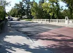 The Maple Street Overpass is a historic bridge in Fayetteville, Arkansas. The bridge carries West Maple Street over the railroad tracks running just east of the University of Arkansas at Fayetteville campus. It is a reinforced concrete single-span arch, 60 feet (18 m) in length and 25 feet (7.6 m) in width. The bridge has a decorative Art Deco balustrade with inset lights on both sides. The bridge was designed by regional bridge designer Frederick Lutt Johann, and built in 1936.[2]
