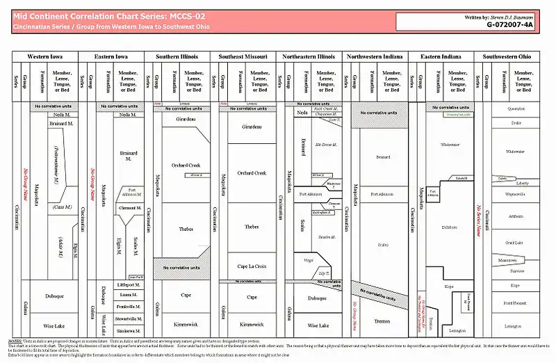 The Maquoketa Group is an assemblage of several geologic formations. It is Upper Ordovician in age and named for the Maquoketa River in Iowa. It exists in Missouri, Wisconsin, Iowa, Illinois, and Indiana. It is equivalent to the all but the basal formations of the Cincinnati Group in Ohio. Illinois and Indiana are the only states where the Maquoketa is considered a group. In other states it is a formation. The Maquoketa was deposited in a shallow intercontinental sea. Most of the clastic sediments are derived from the Appalachians, which were being raised at the end of the Ordovician. To a lesser degree some of the sediments were derived from the Ozark highlands to the southwest.