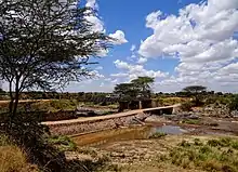 The Mara River basin covers a surface of 13,504 km2, of which approximately 65% is located in Kenya and 35% in Tanzania.[1] From its sources in the Kenyan highlands, the river flows for about 395 km and originates from the Mau Escarpment and drains into Lake Victoria. The basin can be roughly divided into four land use and/or administrative units.