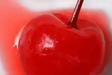 A maraschino cherry (/ˌmærəˈskiːnoʊ, -ˈʃiː-/ MARR-ə-SKEE-noh, -SHEE-) is a preserved, sweetened cherry, typically made from light-colored sweet cherries such as the Royal Ann,[1] Rainier, or Gold varieties. In their modern form, the cherries are first preserved in a brine solution usually containing sulfur dioxide and calcium chloride to bleach the fruit, then soaked in a suspension of food coloring (common red food dye is FD&C Red 40), sugar syrup, and other components.[2]