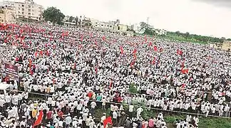 The Maratha Kranti Morcha, loosely translated as "Maratha revolutionary demonstration" in the Marathi language, is a series of silent and pragmatic protests organized by the Maratha community in various cities across India as well as overseas. Other groups, such as religious minorities including Muslims, have also supported the Morcha.[1] The impetus for the rallies was the rape and murder of a 15-year-old girl in Kopardi village, Maharashtra, on 13 July 2016.[2] The protesters have demanded the death sentence for the rapists. Maratha caste dominate the power and cultural structure in Maharashtra owing to their numerical strength.[3]