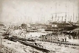 Ferrez's life was dedicated to the art of photography and he is considered one of the greatest photographers of his time. His production was massive, and his photographs document the consolidation of Brazil as a nation and Rio de Janeiro as a metropolis. Emperor Pedro II declared Ferrez the "photographer of the Royal Navy", because of his superior skill of neutralizing the ships movements.[1] In 1876, he entered his photos into an exhibition, with an ethnological interest, called Exhibition of the Century in Pennsylvania. He won a gold medal. In 1882 he won in the South American Continental Exhibition in Buenos Aires.[4] In 1904, he entered his material into the world fair in St. Louis. He was the only photographer to win a gold medal. In 1907, he opened his own picture house in Rio de Janeiro, Pathé Cinema. It was here that he tried out new technology that enhanced the field of photography.[2] During the end of his life he focused more on photographing architecture and street scenes in Rio de Janeiro. Ferrez's most popular works were of Brazilian landscapes. Natural features: mountains, waterfalls, jungles. Man-made engineering, railroads, bridges, and urban buildings. Ferrez is considered by photography historians to be a master at his craft; his work is on the same level as famous photographers William Henry Jackson and Eadweard Muybridge.[3]
