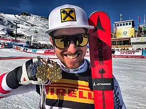 Marcel Hirscher (born 2 March 1989)[1] is an Austrian former World Cup alpine ski racer.[2] Hirscher made his World Cup debut in March 2007. He competed primarily in slalom and giant slalom, as well as combined and occasionally in super G. Winner of a record eight consecutive World Cup titles,[3] Hirscher has also won 11 medals at the Alpine Skiing World Championships, seven of them gold, a silver medal in slalom at the 2014 Winter Olympics, and two gold medals in the combined and giant slalom at the 2018 Winter Olympics. Due to his record number of overall titles and many years of extreme dominance of both slalom and giant slalom, he is considered by many, including his former rivals Henrik Kristoffersen, Kjetil Jansrud and Alexis Pinturault, to be the best alpine skier in history.[4][5][6] He won a total of 67 World Cup races, ranking second on the male all-time list. [7]