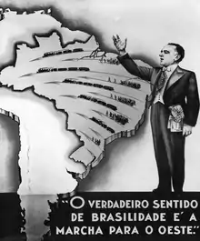 The March to the West was a public policy engendered by the government of Getúlio Vargas during the Estado Novo (1937-1945) in order to develop and integrate the Center-West and North regions of Brazil, which until that moment had a low population density, quite different from what occurred in the Brazilian coastal region.[1] At the beginning of the 1940s, practically all of the country's 43 million inhabitants were concentrated along the coast and saw the interior of their own country as something exotic. The region was nothing more than a huge and unexplored spot in Brazilian geography.[2]