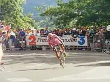 In 1994, he finished fourth at the Giro del Trentino and the Giro di Toscana before his second participation at the Giro d'Italia, where he was supposed to help Chiappucci.[13] He won two consecutive mountain stages, earning his first victory as a professional in the fourteenth stage to Merano. In the following stage to Aprica, which featured the renowned Stelvio Pass and the Mortirolo Pass, Pantani attacked at the base of Mortirolo and broke free at the Valico di Santa Cristina to win the stage at Aprica and place second in the overall classification.[13] He ultimately finished the race behind Eugeni Berzin but ahead of Miguel Induráin, who had won the two previous Giros. That same year Pantani made his Tour de France debut, coming in third and winning the young rider classification along the way. In 1995, he was hit by a car while training, preventing him from riding the Giro, but he rode the Tour and won stages at Alpe d'Huez and Guzet-Neige. He also finished thirteenth and claimed his second successive best young rider prize. He also won a stage at the Tour de Suisse and finished third in the 1995 World Championships road race in Duitama, Colombia, behind Spaniards Abraham Olano and Miguel Induráin. Shortly after returning to Italy, he collided head-on with a car during the Italian Milano–Torino race, sustaining multiple fractures to the left tibia and fibula,[14] injuries that threatened his career and forced him to miss most of the 1996 season.