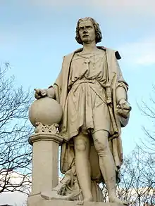 Marble statue of Christopher Columbus was erected on the west plaza in 1976.[3] This work was originally located along Belmont Avenue in Fairmount Park, having been unveiled on October 12, 1876, for Philadelphia's Centennial Exposition. Thought to be the work of Emanuele Caroni, this is said to be first publicly funded monument to Christopher Columbus in the United States. It was purchased for $18,000 with money raised by Italian-Americans and the Columbus Monument Association, through the efforts of Alonzo Viti of Philadelphia and his brothers. The statue's initial installation began an annual tradition for the colony of mostly Italian Americans in South Philadelphia to march each year on Columbus Day to the statue in Fairmount Park. The 6-mile (9.7 km) journey was found to be too exhausting and in 1920 the celebration changed locations.