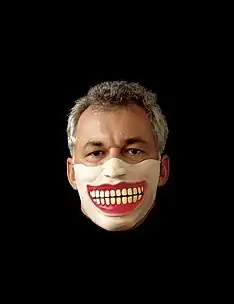 Laughing Mask is part of three self-portrait mask videos by Chaves. It shows a disembodied head floating in the middle of a black screen. A latex carnival mask the artist bought in central street market of Rio de Janeiro covers the face from just below the eyes. It is dominated by a grotesquely over-sized mouth, fixed in a horrifying smile, which reveals two banks of yellow teeth.[11]