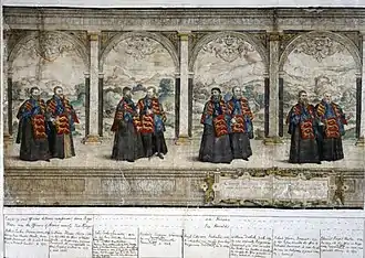 Two works depicting celebrations, the Fête at Bermondsey and A village festival (Hatfield House, Herefordshire), England), formerly attributed to Flemish artist Joris Hoefnagel, were attributed to Marcus Gheeraerts the Elder in 2015.[12] An inscription on the first painting indicates it was painted on commission by the Flemish merchant Jacob Hoefnagel, a brother of Joris Hoefnagel and a resident of London. The inscription also mentions that Jacob Hoefnagel wanted the picture to depict all the fashions that could be seen in England. Gheeraerts followed this instruction by depicting the figures in costumes from England, France, Venice and other European countries. These costumes were based on a publication depicting various costumes compiled and illustrated by Flemish émigré artist Lucas de Heere. It is believed both paintings depict marriage celebrations. The location of the Fête is the river bank of the Thames while the Festival is placed in an imaginary landscape. In both paintings, a procession is moving from right to left headed by two men carrying large oval cakes, two violinists and a man bearing a vase with rosemary tied with ribbons. The faces of the figures are rendered with precision and are likely portraits of members of the Flemish community in England. The paintings may have been intended to showcase the dignity and piety of the Flemish émigré community in England and to assert their proper place in their adopted country. It is believed that the man looking at the viewer appearing in both paintings is a self-portrait of the artist Gheeraerts.[13]