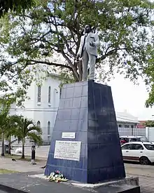 In 1905 he moved to Kingston, where he boarded in Smith Village, a working-class neighbourhood.[20] In the city, he secured work with the printing division of the P.A. Benjamin Manufacturing Company. He rose quickly through the company ranks, becoming their first Afro-Jamaican foreman.[21] His sister and mother, by this point estranged from his father, moved to join him in the city.[22] In January 1907, Kingston was hit by an earthquake that reduced much of the city to rubble.[23] He, his mother, and his sister were left to sleep in the open for several months.[24] In March 1908, his mother died.[22] While in Kingston, Garvey converted to Catholicism.[25]