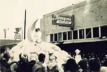 Pensacola's first ladies mystic society, the "Pompadour Mystic Society" (the Pompadours), held its first annual Mystic Ball at the Armory Hall on February 19, 1909, crowning Dudley Thornton as King.[29] The "Revellers of Ariola", Pensacola's first male mystic society, was organized in 1909[30] and held its first Tableau Ball at the K of C Hall on January 28, 1910, crowning Miss Cornelia Bass as Queen of Ariola.[31] In 1936, the female krewe "Merry Markers" held its first ball in 1936.[32] With the exception of the Pompadours, these founding Carnival Season organizations remain active in Pensacola's celebrations to this day.