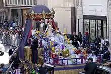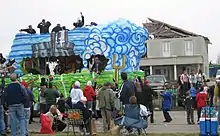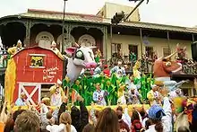 Mobile first celebrated Carnival in 1703 when French settlers began the festivities at the Old Mobile Site.[12] Mobile's first Carnival society was organized in 1704, when Nicholas Langlois founded Société de Saint Louis.[13] In 1711 it was renamed the Boeuf Gras Society (Fatted Ox Society) (1711–1861).[14] In 1830 Mobile's Cowbellion de Rakin Society was the first formally organized and masked mystic society in the United States to celebrate with a parade.[12][15] The Cowbellions got their start when Michael Krafft, a cotton factor from Pennsylvania, began a parade with participants' carrying rakes, hoes, and cowbells.[15] The "Cowbellions" introduced horse-drawn floats to the parades in 1840 with a parade entitled, "Heathen Gods and Goddesses".[14] The Striker's Independent Society was formed in 1843. It is the oldest surviving mystic society or krewe in the United States.[14]