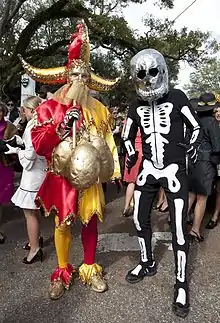 Mobile's mystic societies give formal masquerade balls, known as bal masqués, which are almost always invitation only and are oriented to adults.[10] Attendance at a ball requires that a strict dress code, or costume de rigueur, be followed. The formal dress code usually involves full-length evening gowns for women and white tie with tails for male invited guests, and masked costumes for society members.[10] The balls feature dramatic entertainment, music, dancing, food, and drinks.[10] Balls are usually based upon a theme which is carried out through scenery, decorations, costumes, and a tableau vivant.[10]