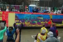 Louisiana State troopers and National Guard assisted with crowd control for the first time since 1979. Many of the floats had been partially submerged in the floodwaters for weeks. While some krewes repaired and removed all traces of these effects, others incorporated flood lines and other damage into the designs of the floats. Most of the locals who worked on the floats and rode on them were significantly impacted by the storm, and many had lost most or all of their possessions, but their enthusiasm for Carnival was even more intense than usual and celebrated as an affirmation of life. The themes of many costumes and floats had more barbed satire than usual, with commentary on the trials and tribulations of living in the devastated city, with references to MREs, Katrina refrigerators and FEMA trailers, along with much mocking of the Federal Emergency Management Agency (FEMA), and local and national politicians.