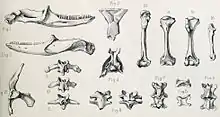 Skulls, mandibles, sternum, furcula, coracoids, humeri, ulnae, femora, tibiotarsi, carpometacarpus[9] |