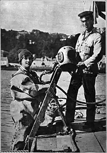 Naylor was fascinated by the work of the divers and asked Foss for the opportunity to dive herself. Initially her proposal was rebuffed but after Naylor studied the subject and questioned the male divers, Foss relented and with no prior experience allowed Naylor to dive on the wreck, 70 feet (21.3 m) down. The first dive almost ended in disaster as Naylor's suit telephone stopped working and the surface team started to haul her up. On reaching the ladder, the surface team continued to haul but one of Naylor's boots had jammed in the ladder. This had the effect of starting to pull the helmet off. Naylor did manage to jerk the safety rope to stop the team and then managed to free her boot before continuing her assent.[4] Naylor was not discouraged and despite continued opposition dived more and more. Her exploits as the first woman deep-sea diver were reported in the American magazine Popular Science Monthly in August 1920.[5] Her career became more publicly known in the United Kingdom in 1922 following an article in the The Daily News which was syndicated across North America and Australia.[6][7][8]
