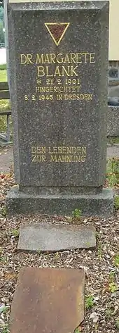 Margarete Blank (1901–1945) was a German medical doctor who was executed for defeatist speech in 1945. There are now several memorials to her including street names in Engelsdorf and Panitzsch; old people's homes in Prenzlau and Thekla, Leipzig; schools in Panitzsch and Torgau; and an annual prize for a work of medical history at the Leipzig Medical School.[1][2][3][4][5]