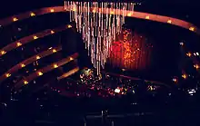 A key design feature is the 318-rod chandelier located inside the performance hall, named The Moody Foundation Chandelier. The chandelier hangs 50 feet below the ceiling. Starting Friday, June 28, 2013, the traditional pre-performance ascent of The Moody Chandelier has been accompanied by an exclusively adapted piece “The Light” by American composer Philip Glass.[3] Once retracted into the ceiling, it leaves the impression of a star lit night, as each rod has the ability to "twinkle." The acrylic rods are illuminated by three primary color LEDs which allows the chandelier to be lit in virtually any color.