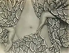 It was during this same period that she became close friends with and repeatedly photographed the budding artist Billy Justema. Justema was nearly 20 years younger than Mather, and they formed a mutually beneficial and platonic relationship that lasted many years. Justema said that Mather "would nurture and shield me, thoroughly and unwittingly corrupt me, and…set up standards of ethical behavior and artistic excellence,"[22] while Mather thrived on the new and changing circle of talented musicians and artists that Justema brought to her home. One of her most famous images, Semi-Nude, a strong horizontal image of Justema's abdomen and contorted hands wrapped loosely by a boldly patterned kimono, was made soon after the two met. This is the earliest example of a strong decorative element in Mather's work, and she would use this stylistic device repeatedly as she continued to develop for own artistic vision.