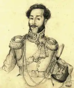 Later that month, Gheorghe secretly left the country, leaving Bucharest to be fought over between the Wallachian provisional government and a conservative dissident, Ioan Odobescu.[71] According to Lăcusteanu, the departing Prince was sure that he would be returned to the throne by "the Moskals", who "are set to enter Bucharest in three to four days".[72] Marițica followed her husband into exile, both of them initially settling at Corona.[73] On June 29, another conservative coup in Bucharest briefly established a triumvirate comprising Neofit and two of Marițica's uncles: Teodor Văcărescu and Emanoil Băleanu. All three were captured and expelled over the border with Austria.[74] Eventually, the revolution was dealt with by a two-stage invasion of Wallachia, seeing cooperation between the Ottoman Army and Russian forces, led by Mehmed Fuad Pasha, Abdülkerim Nadir Pasha, and Alexander von Lüders; the only battle was fought over Dealul Spirii in Bucharest.[75]