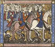 Completely disabled due to leprosy, Baldwin IV lay on his deathbed in early 1185. He arranged for Sibylla's son, Baldwin V, to undergo a crown-wearing ceremony after which Balian expressed his family's support by carrying the boy to banquet on his shoulders.[46] The High Court awarded regency to Raymond of Tripoli. Raymond demanded that, in the case of Baldwin V's death, the decision of whether the crown should pass to "Sibylla, who was the daughter of Countess Agnes" or "Isabella, who was the daughter of Queen Maria", would be made by the pope, the Holy Roman emperor, and the kings of England and France.[47] Baldwin died after the barons promised to uphold this condition.[48]