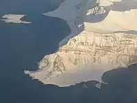 Mariaholmen on the left side of the oblique aerial photograph, off Gåsbergodden , the western tip of Nathorst Land.