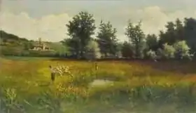 Vayreda kept painting through all of his adult life, though some scholars claim that in the mid-1890s he was gradually turning towards literature, either due to lack of public recognition[81] or following death of his brother.[82] His first picture discussed in literature is dated 1876,[83] the last one 1901;[84] total number of his works is unclear and it probably amounts (including sketches and unfinished ones) to few hundred.[85] Most of them are small[86] and very small[87] compositions bordering sketches, though his best known paintings are significant in size.[88] His ultimate technique was oil on canvas; minor works could be also charcoal or oil on cardboard;[89] the peculiarity of his method was preference for a studio instead of plein air; he composed paintings on basis of previous sketches and minor works.[90]