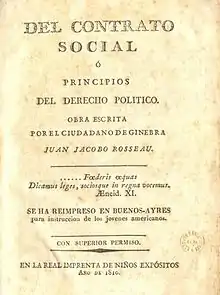Mariano Moreno studied French and Spanish authors of the Age of Enlightenment during his studies at Chuquisaca. Jean-Jacques Rousseau's The Social Contract was the main influence; he translated this work into Spanish and used it to justify the actions of the Primera Junta. Contemporary people as Ignacio Núñez and Tomás de Anchorena acknowledged him as the translator. However, as the main page said that the work was "reprinted in Buenos Ayres", some historians doubt whether it was actually Moreno's work. Vicente Fidel López claimed that Moreno reprinted the translation made by the Spaniard Gaspar Melchor de Jovellanos, but the two translations differ.[143] Paul Groussac thought it was a reprint of an Asturian translation, and Ricardo Levene said that Moreno was not the translator, but neither gave any indication as to who they thought had completed it.[144] Enrique de Gandía considers that the comments of contemporary people and the lack of an earlier similar translation of Rousseau's work allow us to conclude that Moreno must have been the translator, at least until an earlier translation is found.[145]