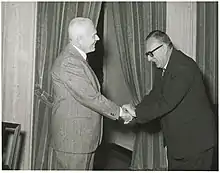 In 1954, after the National Congress of Naples, which saw the affirmation of Democratic Initiative and the subsequent election of Fanfani as party's Secretary, Rumor was elected again deputy secretary.[21] He held this office for the next five years, until Democratic Initiative split up. In fact, many members of the faction, started criticizing the political line of Fanfani's secretariat, who cautiously began to open to the prospect of a collaboration with Italian Socialist Party (PSI).[22] Prominent members of the faction, including Rumor himself, put the Secretary in minority during the National Congress of March 1959. In this way, Democratic Initiative split up between the followers of Fanfani and the dissident group, now renamed by all Dorotei ("Dorotheans"), from the place where they had gathered before the congress, the convent of the sisters of Santa Dorotea in Rome. The new faction was built around Antonio Segni, Mariano Rumor and Aldo Moro, who was elected new Secretary.[23]