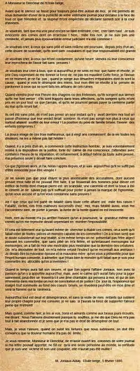 On February 4, 1894, her brother, a former cavalry captain, was forced to resign due to financial misfortune. A widower since 1871, he settled in Paris where he had a relationship with a mistress, Marie Roguet, was attracted to Antwerp by his sister. He had just lost his job in Paris and planned to beg for an alimony from his son, Georges. Alfred was jobless in Paris until he found a job as a bookkeeper. He also benefitted from a small supplementary pension paid by his mother-in-law, Madame Meskens. He lost his job, and called his sister who said that she wanted to help him. She offered to pay him an annuity in exchange for an insurance on his life worth 100,000 Belgian francs, of which she would be the beneficiary. He contacted a company in Paris but the conditions did not satisfy Joniaux, because of the high monthly payments. He arrived in Belgium, and his sister took things in her hands, contacting a London company named Gresham who had a seat in Antwerp. On February 17, 1894, the policy was underwritten and the first quarterly bonus was paid by Joniaux. She explained to the insurers that this is to cover important advances that she made to her brother and that she wanted to benefit her children. Alfred Ablay died at his home on the night of March 5 or 6, 1894.