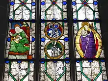 The nave is lit by two levels of windows with pointed arches in the side galleries, which are separated by a cornice. The choir has five large windows with pointed arches. In the northeastern choir window are the remains of the old stained glass windows, which include a depiction of Mary with Child in the aureole from the previous church and one of Elizabeth of Hungary from the date of the present church's original construction, flanking depictions of the coats of arms of Wais von Fauerbach (above) and of Büches (below).[22] The rest of the window paintings date to the nineteenth century. In the southern side aisle there are stained glass depictions of Martin Luther and Philip Melanchthon, as well as the risen Christ.[23] At the west end there is a pointed arch window inserted high up in the wall.[18]
