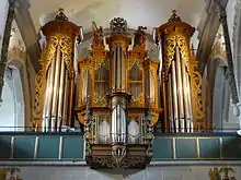 The organ was built during the Thirty Years' War between 1621 and 1624 by the organ-builder Georg Wagner of Lich and had around 20 registers with two manuals and a pedalboard, as well as wing doors on the sides.[34] The instrument was originally located where the Fürstenstuhl now stands. Between 1631 and 1633, the organ was expanded with the two pedal towers of the organ of Arnsburg Abbey which was probably also built by Wagner around 1607. These were brought to Lich to protect them from being plundered by Swedish troops. The Lich-based organ firm, Förster & Nicolaus Orgelbau relocated the organ in 1861 from the small gallery in the ambulatory to the west gallery and modified its tuning. The instrument was modified repeatedly by the firm over time. In 1913, a substantial renovation took place in the course of which the organ received tubular-pneumatic action, cone chests, a free-standing console, an expression pedal and several new registers. A further rearrangement followed in 1941 in the course of the organ reform movement. In 1961, the empty rear housing was refilled with new registers in a slider chest. A new organ with mechanical tracker action was installed in the old housing, incorporating the old registers, in 1972. Finally, further tunings were added in 2002, so that the modern instrument contains over 39 registers and can adequately reproduce a broad range of styles.[35]
