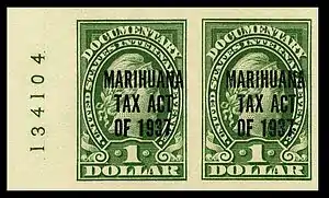 The Marihuana Tax Act of 1937, Pub. L. 75–238, 50 Stat. 551, enacted August 2, 1937, was a United States Act that placed a tax on the sale of cannabis. The H.R. 6385 act was drafted by Harry Anslinger and introduced by Rep. Robert L. Doughton of North Carolina, on April 14, 1937. The Seventy-fifth United States Congress held hearings on April 27, 28, 29th, 30th, and May 4, 1937. Upon the congressional hearings confirmation, the H.R. 6385 act was redrafted as H.R. 6906 and introduced with House Report 792. The Act is now commonly referred to, using the modern spelling, as the 1937 Marijuana Tax Act. This act was overturned in 1969 in Leary v. United States, and was repealed by Congress the next year.[1]