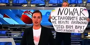 After a few seconds, the broadcast cut away to a recorded segment.[18][16][17] The recording of the news program was not available for download, which is uncommon for this TV channel.[18][19][20] The protest was unusual as the state-operated program does not deviate from the Kremlin line of a "special military operation", and viewers had previously not been told that the Russian invasion of Ukraine was a war.[6]