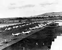 Two weeks after the activation of MAG-24, on 15 March, the Headquarters Squadron commanded by Capt John K. Little departed for Efate, New Hebrides to help construct an airfield.[9] The importance of Efate to the U.S. war effort was its relative location. Admiral Ernest King, Chief of Naval Operations, stated: "let Efate be the first rung in a ladder from which a step-by-step general advance could be made through the New Hebrides, Solomons, and Bismarcks." Over the next 24 months, the Allies accomplished exactly that.[10] While never attacked by the Japanese at Efate, the efforts to construct the airfield were hampered by a lack of appropriate engineering equipment and malaria. Capt Little and the men of MAG-24 received a letter of commendation from Brig Gen Neal C. Johnson, USA for work completed "in the face of tremendous odds."[10] Simultaneously during this period VMF-212 was transferred from MAG-24 to MAG-21 and deployed from Ewa to Efate over the period of 29 April to 9 June.[10] Efate would be significant in addition to the "first rung." The airfield was used as a place of respite and training for rotating squadrons to the front line. Additionally, the 3rd Marine Division used the island for amphibious rehearsals to incorporating lessons learned from Guadalcanal.[11] The Headquarters Squadron of MAG-24 departed Efate for MCAS Santa Barbara on 24 May[12] and by August 1942 the airfield had a 6000 ft runway capable of supporting combat operations for Guadalcanal.[13]