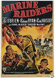 Marine Raiders is a 1944 RKO war film showing a fictional depiction of the 1st Marine Raider Battalion and 1st Marine Parachute Battalion on Guadalcanal, R&R in Australia, retraining in Camp Elliott (where much of the film was made) and a fictional attack in the Solomon Islands. Produced by Robert Fellows, and directed by Harold D. Schuster, it stars Pat O'Brien, Robert Ryan, and Ruth Hussey.