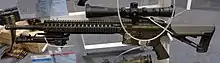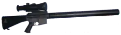 The first generation MSSR was deployed in 1996 as an M16A1 with a Tasco variable 3-9 x 40 mm rubber-coated scope on a DPMS Tri-mount atop the carry handle.[7] This required a Delta HBAR cheek piece on the stock to align the operator's eye with the elevated scope position.[7] The standard handguards were replaced with a free-floating aluminum forearm, and a Harris folding bipod was attached to the underside of the forearm. The standard M16A1 barrel was replaced with a free-floated 24" (68 cm) DPMS Heavy Stainless Steel Ultra Match barrel with a 1 in 8.5" right-hand twist, with an M16A1 front sight base.[7] A J&P match trigger was installed, which is later used in the second and third generation versions.[7]