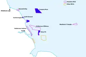 Holderness offshore lies 6 nautical miles (11 km; 6.9 mi) off the coast of the East Riding of Yorkshire, with Barmston and Kilnsea being its northern and southern end points respectively.[21] The site, which is 160 feet (50 m) deep and covers an area of 454 square miles (1,176 km2), is noted for its ross worms, crabs, lobsters and ocean quahogs.[24] The site also overlaps the Southern North Sea Special Area of Conservation, which protects harbour porpoises.[25]