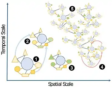 The boundaries of holobionts are usually delimited by a physical gradient, which corresponds to the area of local influence of the host, e.g., in unicellular algae the so-called phycosphere.[25] However, they may also be defined in a context-dependent way as a Russian matryoshka doll, setting the boundaries of the holobiont depending on the interactions and biological functions that are being considered. Thus holobionts may encompass all levels of host-symbiont associations from intimate endosymbiosis with a high degree of co-evolution up to the community and ecosystem level; a concept referred to as "nested ecosystems" (see diagram).[26][27][1]